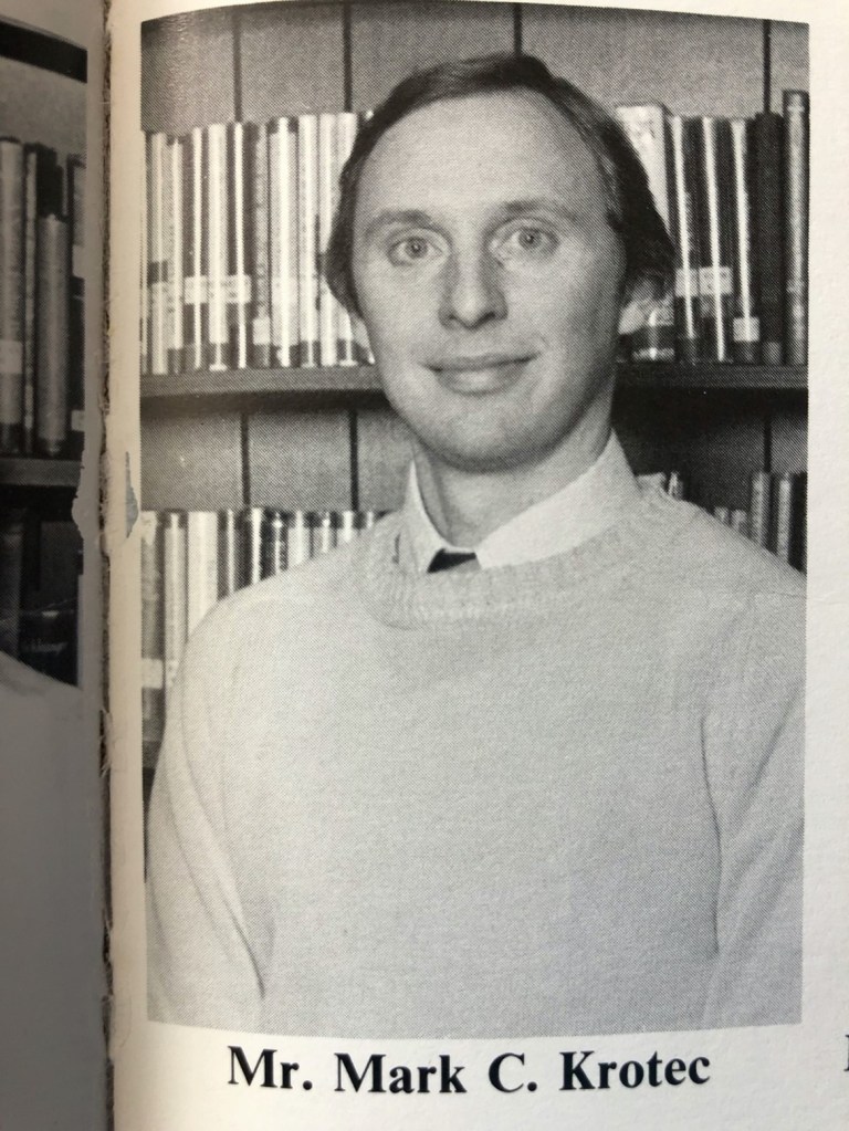 Science was led by Mr Krotec, a wide-eyed instructor that also brought enthusiasm to the classroom. He seemed to know Rusty Cowell at some level and always seemed to poke fun at Rusty for working out with 15-pound weights.